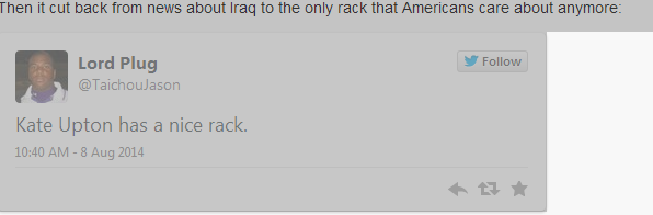 ABC chose to announce, in a brief news report, that President Obama had followed through with the airstrikes option he mentioned in his speech last night. It was the first deadly attack by the U.S. in Iraq since the last troops left nearly three years ago. But Americans had something else on their mind, and they didn’t want to be interrupted from ogling Upton.
