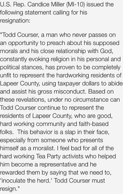 Largely lost in the Todd Courser/Cindy Gamrat scandal is that, beyond quickly calling for Courser’s resignation after the story broke on Friday, Congresswoman Candice Miller issued a scathing indictment of Courser that was as strongly worded as anything you will read in the press.