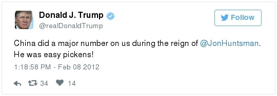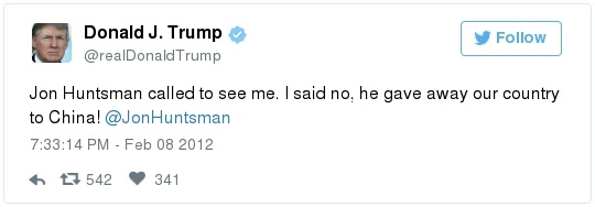 According to the Post’s Daily 202, Trump relished, and even took credit for, Huntsman’s inability to gain traction on economic issues and, over a period of several months, mocked him on Twitter as an ineffective ambassador: