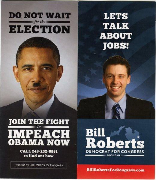 a photo of Obama with a Hitler-style moustache. His campaign materials say