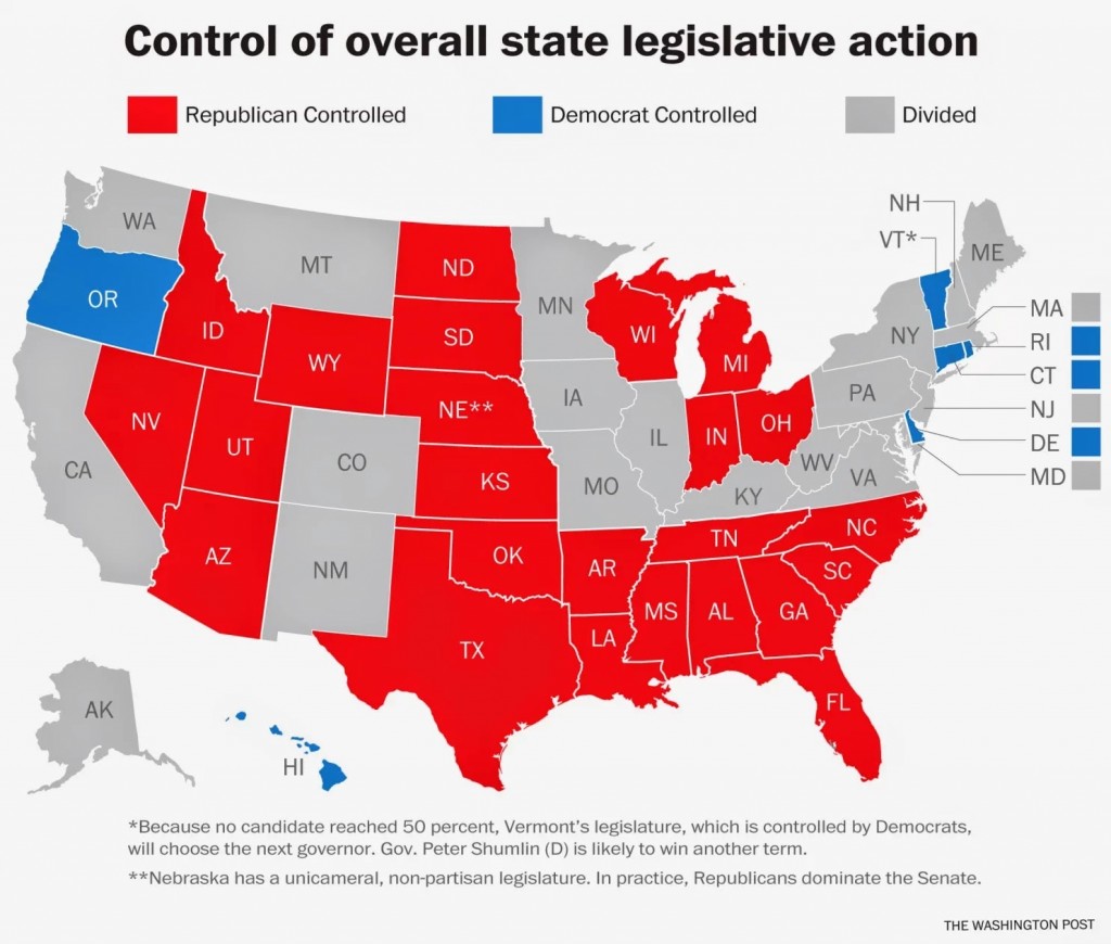 Not only did the Republican Party take control of the Senate and solidify its lock on the House and score some surprising gains in governorships, their hold over state legislatures is now at a record level for the modern era, as The Washington Post map above demonstrates.