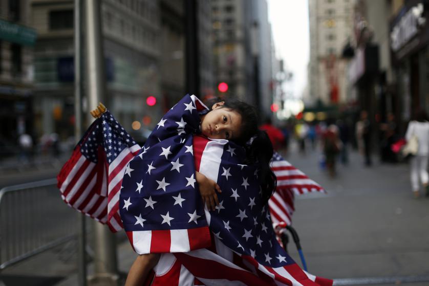 A boy draped in an American flag rests on the shoulders of a flag merchant in Times Square prior to a ticker-tape parade for the U.S. Women’s World Cup championship team. Hilary Swift—The New York Times/Redux