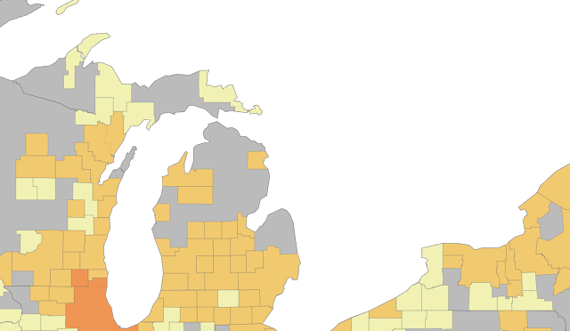 The map above that includes Michigan outlines this phenomenon. The gray areas