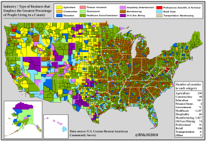 This map also shows that agriculture is the top employer in a shockingly low number of counties – not one in Michigan – which suggests the consolidation of farming into large, agri-business corporations. Only eight counties east of the Mississippi River listed agriculture as their top economic sector.