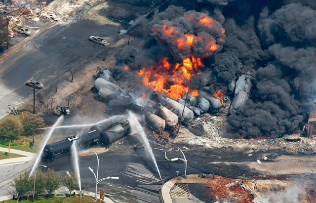 Smoke rises from railway cars that were carrying crude oil after derailing in downtown Lac Megantic, Quebec, Canada, Saturday, July 6, 2013. A large swath of Lac Megantic was destroyed after a train carrying crude oil derailed, sparking several explosions and forcing the evacuation of up to 1,000 people. (AP Photo/The Canadian Press, Paul Chiasson)