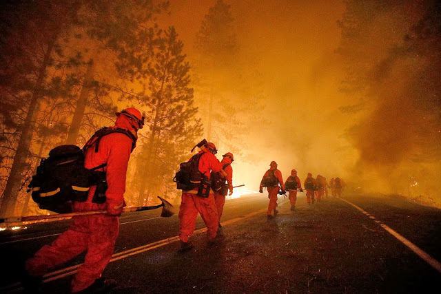 Firefighters walk along Highway 120 after a burnout operation as firefighters continue to battle the Rim Fire near Yosemite National Park, Calif., on Sunday, Aug. 25, 2013. (AP Photo/Jae C. Hong)
