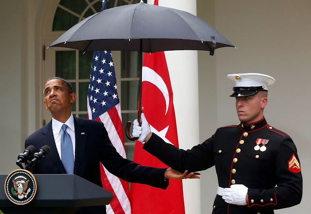 President Barack Obama looks to see if it is still raining as a Marine holds an umbrella for him during his joint news conference with Turkish Prime Minister Recep Tayyip Erdogan, not pictured, Thursday, May 16, 2013, in the Rose Garden of the White House in Washington.(AP Photo/Charles Dharapak)