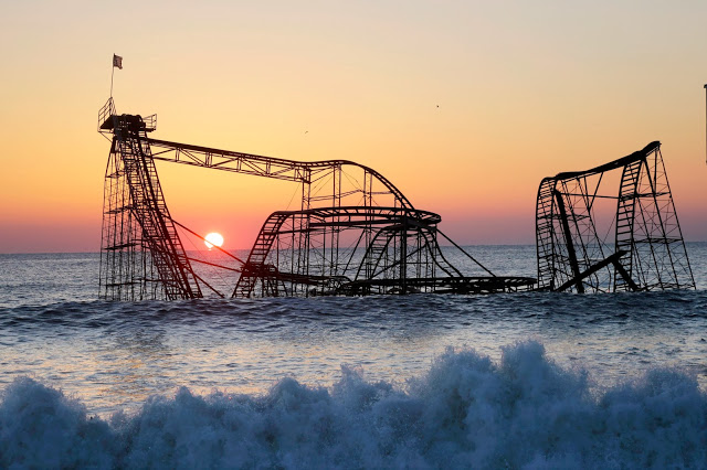 The sun rises in Seaside Heights, N.J., on Monday, Feb. 25, 2013, behind the Jet Star Roller Coaster which was sitting in the ocean after part of the Funtown Pier was destroyed during Superstorm Sandy. The private owners of the amusement pier that collapsed in Seaside Heights were working with insurers to devise a plan to dismantle the ride and get it out of the ocean. (AP Photo/Mel Evans)