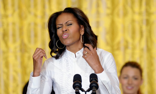 First lady Michelle Obama pretends to dance to music as she arrives to speak in the East Room of the White House in Washington, Friday, Nov. 8, 2013, at a workshop for high school students from Washington, New York and Boston about careers in film. Film and musical theater composer and pianist Alan Menken performed a medley of his music before the start of the event. (AP Photo/Susan Walsh)