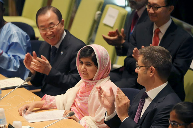 United Nations Secretary-General Ban Ki-moon, left, applauds as the members of the ‘Malala Day’ Youth Assembly wish Malala Yousafzai, center, a happy birthday, Friday, July 12, 2013 at United Nations headquarters. Yousafzai, the Pakistani teenager shot in the head by the Taliban for promoting education for girls, celebrated her 16th birthday by addressing the United Nations. The U.N. has declared July 12 “Malala Day,” to honor the teen who returned to school in March after extensive medical treatment in Britain for injuries suffered in the October attack. (AP Photo/Mary Altaffer)