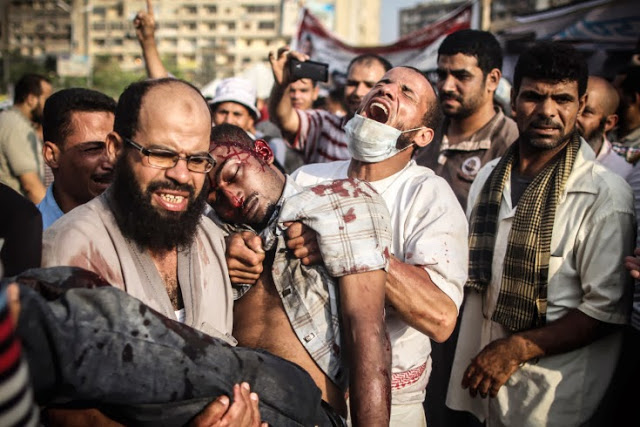 grief-stricken men in Cairo, Egypt, carry a dead young man who was shot in the head on July 27, 2013, as supporters of President Morsi clashed with military forces. Photographer Mosa’ab Elshamy described for TIME the scene: I rushed to Rabaa Adaweya square shortly after midnight on July 27th after